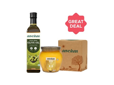 Anveshan Extra Virgin Olive Oil + A2 Desi Gir Cow Ghee (Bilona Churned) Combo, 250 ml + 500 ml is rich, aromatic and made to add deep flavour to your daily cooking. Use it for tempering dals, sautéing vegetables, frying puris, making sweets or topping hot rotis and rice. A small spoon transforms simple meals with that classic, home-style taste families love. Carefully prepared and packed to preserve aroma, colour and consistency. Suits everyday Indian cooking, festive recipes, halwa, ladoos, paratha and tadkas. Store in a cool, dry place; refrigerate after opening for longer freshness and easy scooping. An essential kitchen companion for traditional taste and unmatched fragrance.